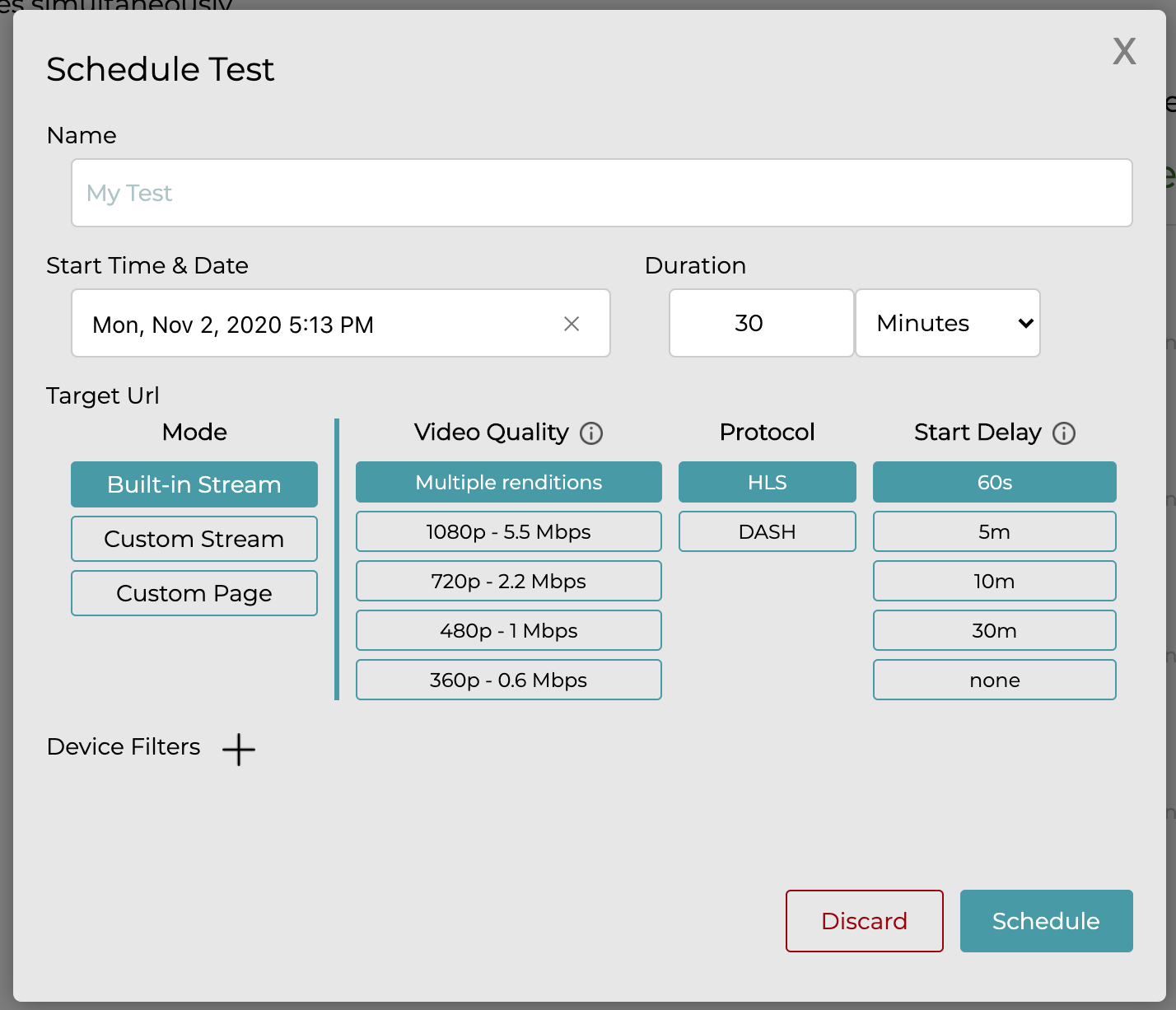 - Duration - The duration of the test. We recommend at least 20m to allow proper simulation.
