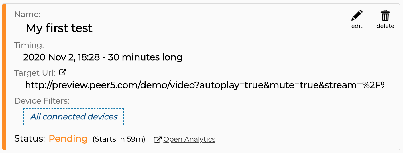 - Custom Stream - You might want to only provide a live stream of your own and use Peer5's auto-integrated page. The stream must be publicly available and include CORS headers so that runners will be able to load it. The stream will be auto-played when the test begins.