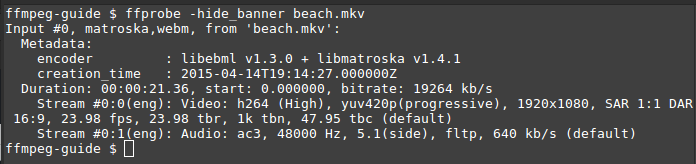 The file is identified as mkv, 21 seconds long, overall bitrate 19264 kbps, containing one video stream of 1920x1080 23.98fps in h264 codec, and one AC3 audio stream 48kHz 640 kbps.