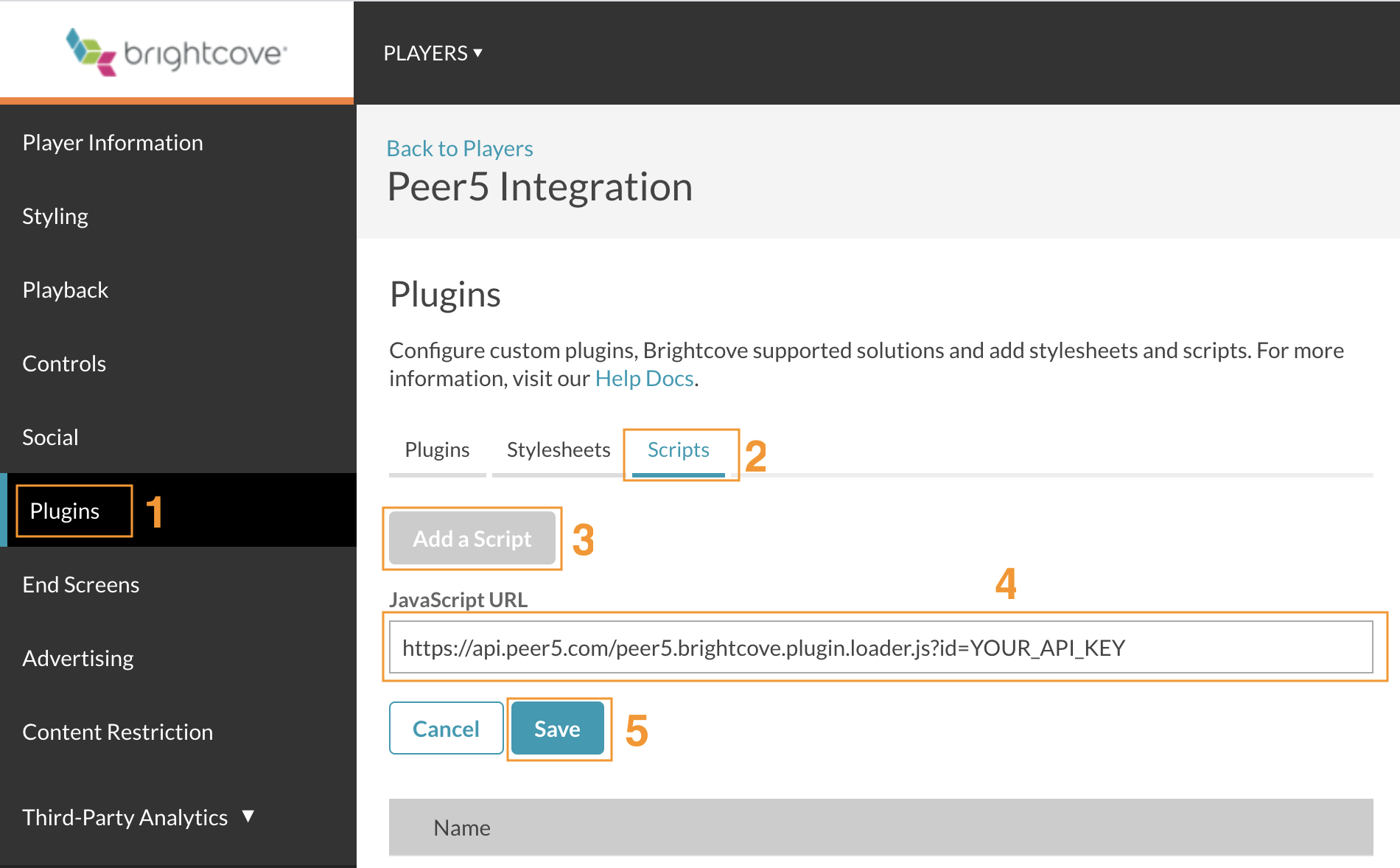 Integration is done through Brightcove's dashboard, follow these steps to integrate you player with Peer5.