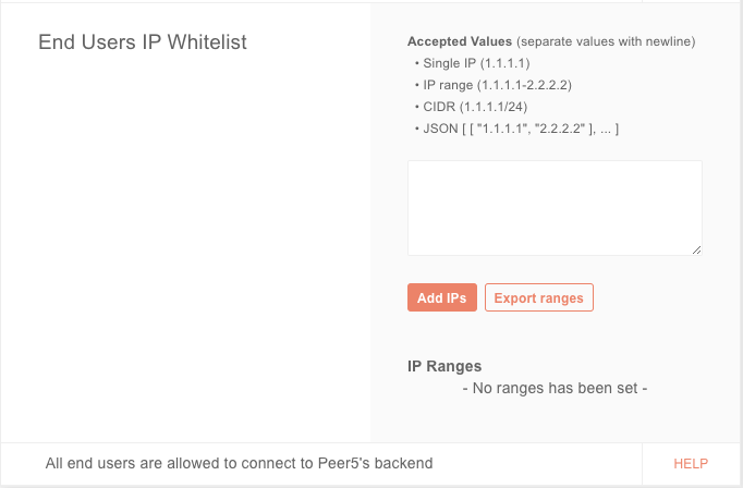 - Add your public IPs in the "End Users IP Whitelist" box in one of the supported formats, as shown below.