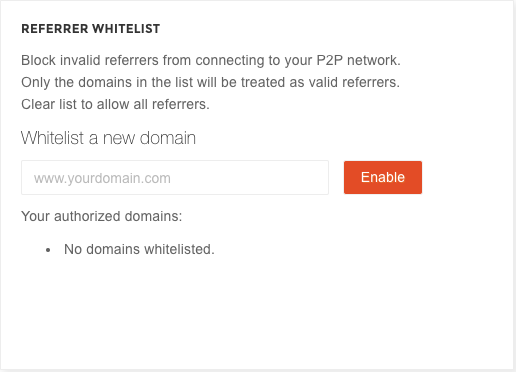 - Add your domains (The ones where the Peer5 scripts are loaded in) in the "Referrer whitelist" box, as shown below.